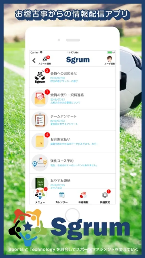 『Sgrum(スグラム)』は、お子さまの通うスポーツクラブ、ご自身が通うお稽古事など様々なシチュエーション(連絡網、会員管理、スクール運営など)において必要な機能を選択し、安全に・確実に情報を伝えることを目的としたプラットフォームです。