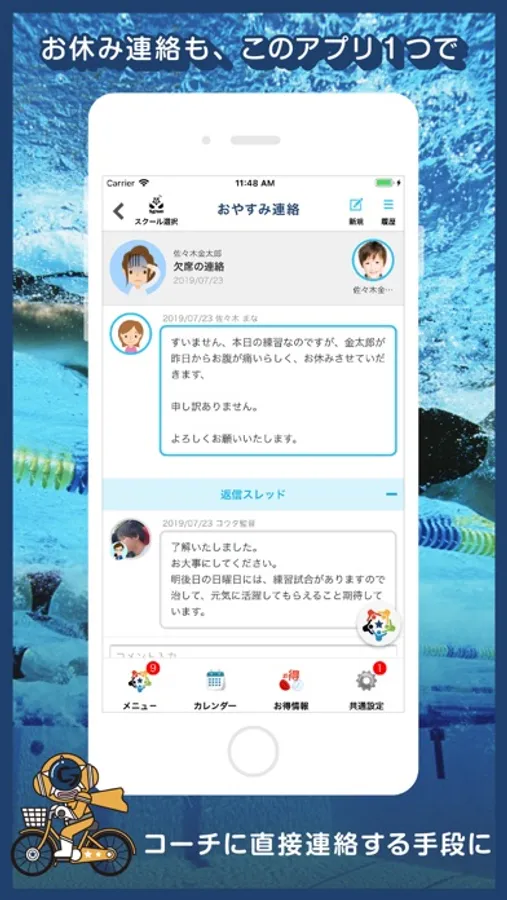 急な用事・体調不良・交通遅延などによる突発的なお休み連絡もSgrumアプリから簡単にスポーツクラブへ連絡が可能です。電話連絡が難しい環境でも配信する事が可能です。