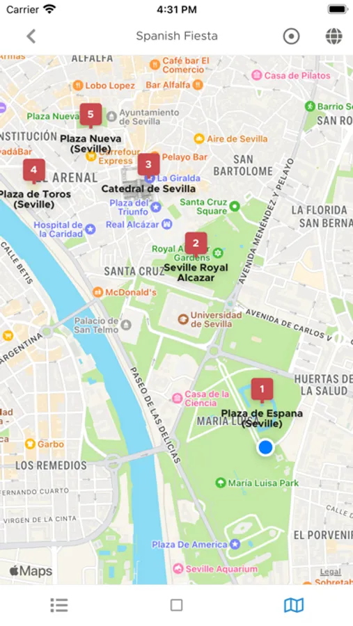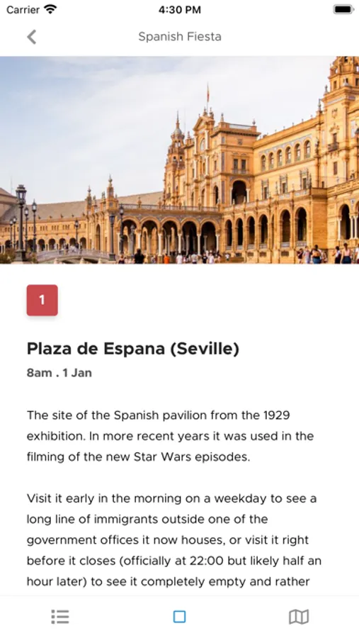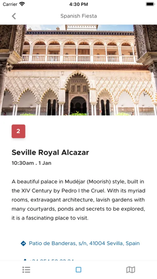 2. A large full-screen map showing markers for the place-activities on your trip. Tap a number-marker *on the map* (e.g. [1], [2], .. ) to bring up Map Directions to the place. Your current location is shown on the map (uses phone GPS, Internet not required).