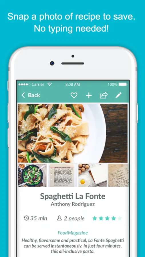 - SNAP any recipe photos easily from cookbooks, magazines, website, or recipe card, and upload multiple images at any 1 time. Saves up to 5 images per recipe quickly. No typing required!