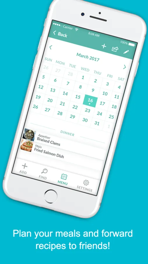 Plan ahead with our in-built meal planner. In a few simple taps, you can easily create menus on our calendar. Like to share the menu or recipe to friends? Now you may forward them easily to anyone, via email or any text messaging app.