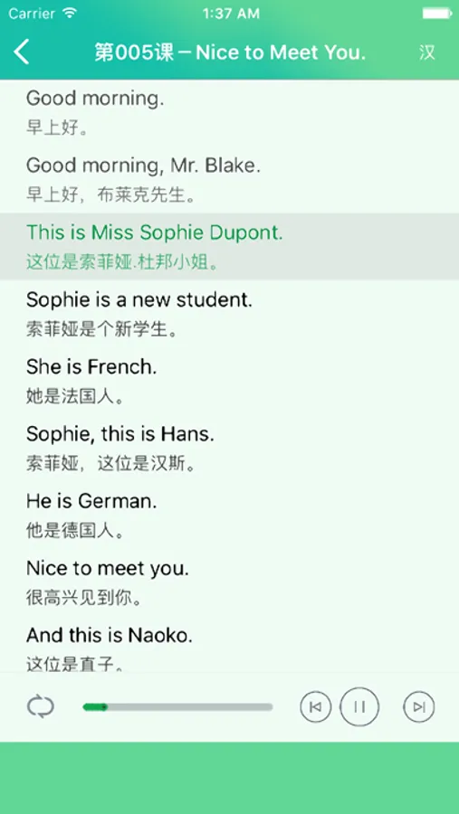 【课文同步】中英译文,有声同步,也可只显示英文;可单句循环,可顺序朗读往复循环,方便你自己控制,反复跟读和背诵。