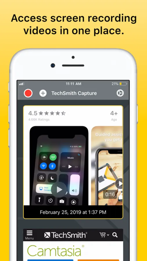 TechSmith Capture™ allows you to quickly record your training and app demo videos on your iPhone or iPad. Share directly from your mobile device to TechSmith Camtasia for editing and enhancements.