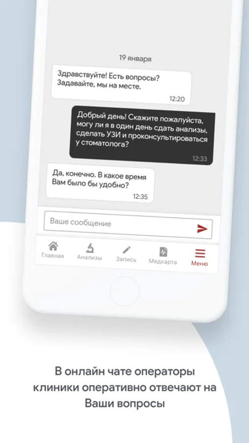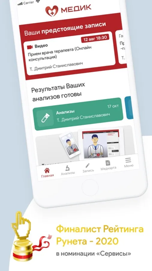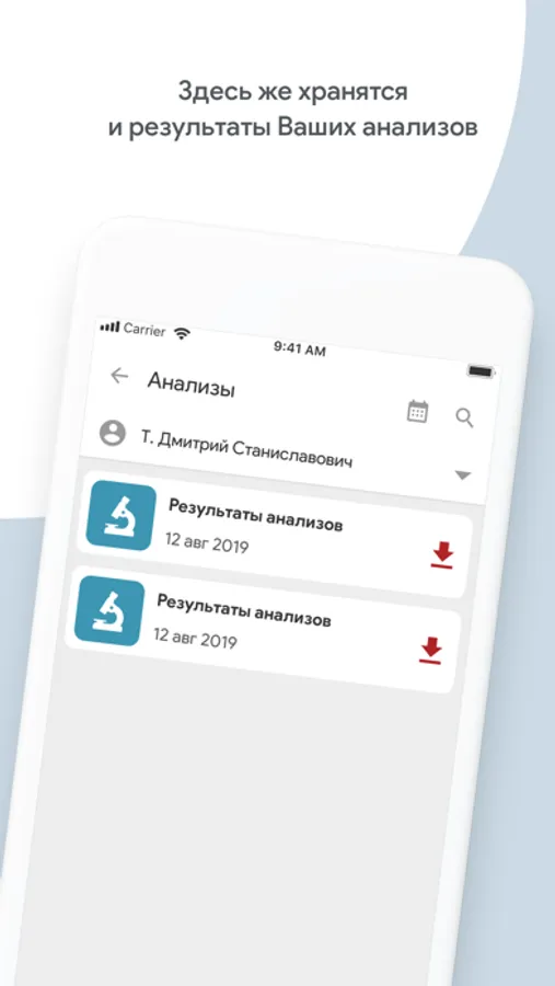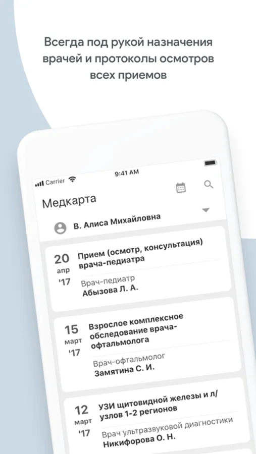 - ваша медицинская карта: протоколы всех пройденных консультаций, исследований, результаты анализов - вся история посещений клиники, к которой вы имеете доступ в любое время и в любом месте;