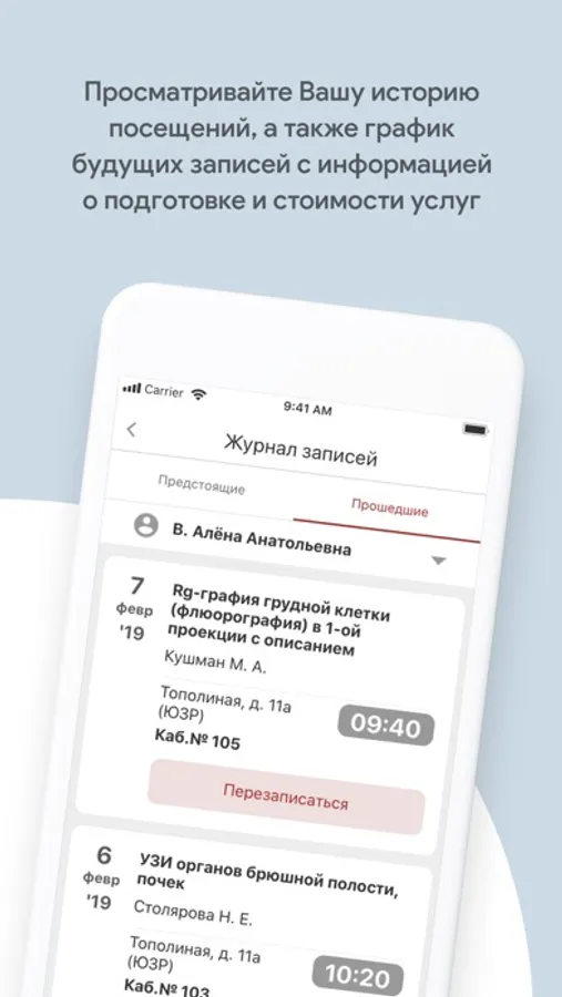 - самостоятельная онлайн-запись на прием с выбором врача, дня и удобного времени без звонка в клинику, возможность оплатить услуги заранее, удалить записи через приложение;