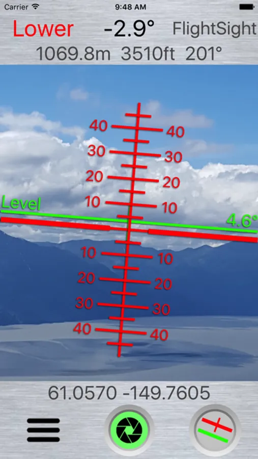 FlightSight is an aviation sight level app. Its purpose is to help pilots determine whether their flight path is above or below distant objects. Position the sight target on cloud tops or bottoms, mountain passes or other aircraft and FlightSight will tell you if the object is higher or lower, and by how many degrees. FlightSight is a low budget HUD (Heads Up Display)! The FlightSight app can be used by holding the iPhone or iPad by hand. Or it can be mounted on the top of the instrument panel.