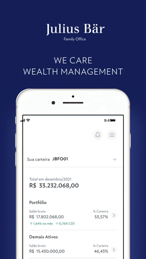 The app allows you to track your patrimony managed by the Julius Baer Family Office, knowing the detailed profitability, portfolio composition, download the monthly PDF statements, and the exclusive content by our research team, and reach your Relationship Manager and the team responsible for your account.