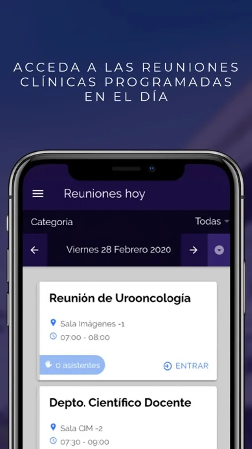 La aplicación se alimenta del calendario de reuniones clínicas del Departamento Científico Docente mediante una integración. Todas las reuniones están representadas y son visibles para todos los usuarios.