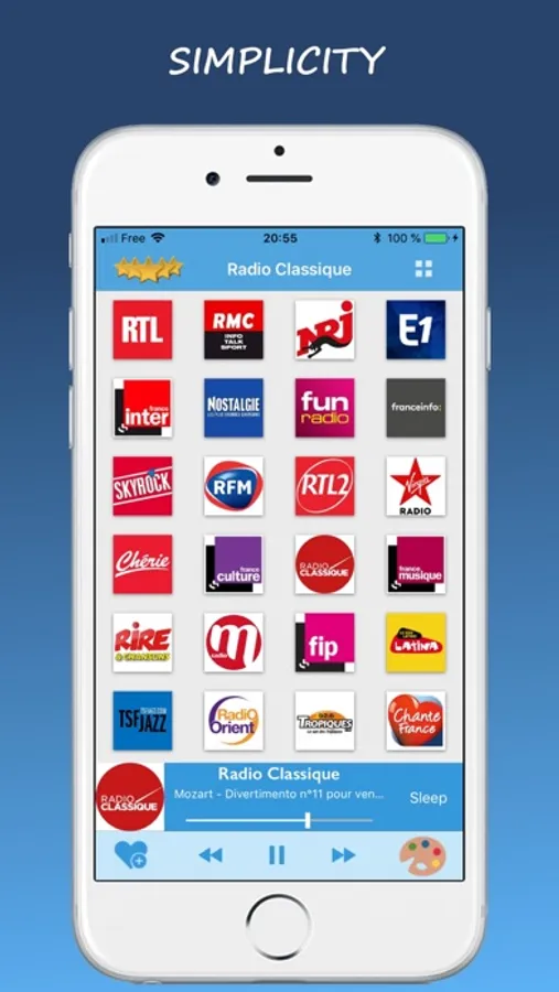 A user-friendly interface which allows you to get to the essentials quickly: enjoy listening radio. This simple, yet powerful, interface is also customizable! We give users the opportunity to choose the display mode (list or grid) and the colour of the theme. And in the favourites menu, you can also change the order of the stations or hide some stations.