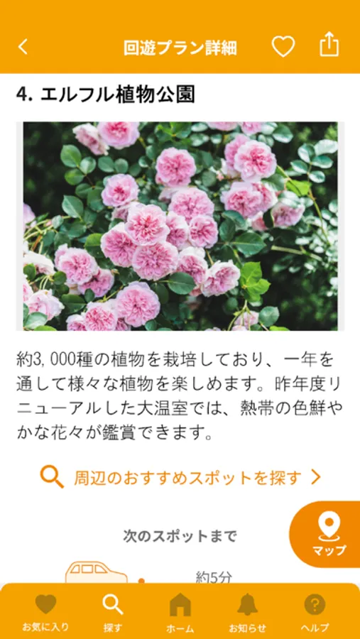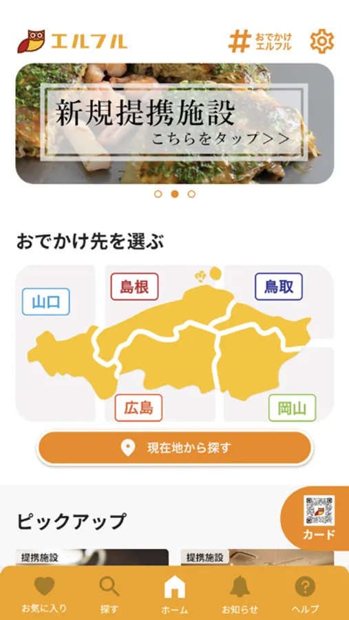 お気に入りの提携施設/イベント/おでかけスポット/回遊プランを登録できます。提携施設に行く前に、お気に入りに登録しておけば、ワンタッチでエルフルカードの利用ができます。