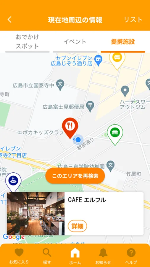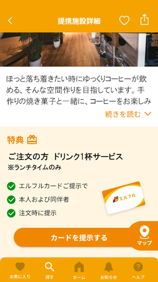 エルフルの提携施設をカテゴリ、エリア、フリーワードで検索し、提携施設の情報や特典情報を確認することができます。またGPS機能により、現在地に近い提携施設を地図上に表示できます。