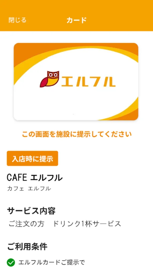 エルフルの提携施設にて、GPS認証やQRコード読取によりエルフルカード表示すると、優待サービスが利用できます。主に中国地方のレジャー、宿泊、温泉、グルメなど様々な施設がありますので、ぜひご利用ください。