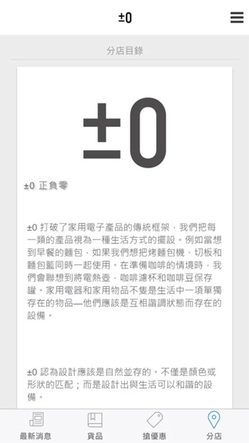 ±0品牌符號,代表著「簡約,恰到好處」。 人們自然地會從過往的經驗來選擇什麼產品最適合他們自己的生活。 這一種探索自己喜好的行為。過程有點像將所有的選擇項逐漸縮小, 再經過三心兩意、猶豫不決、擔心顧此失彼,最後才做出決定。