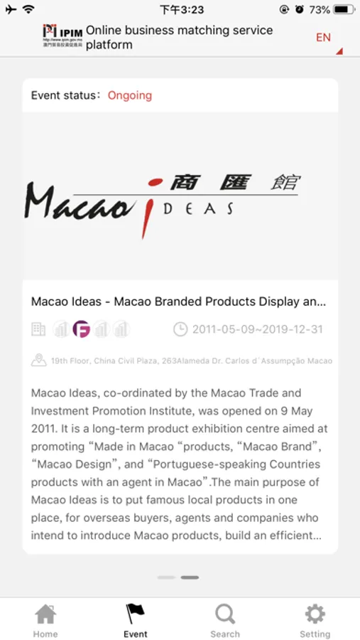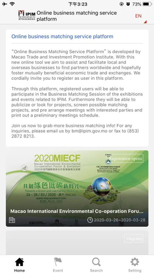“Business Matching Service Platform” is developed by Macao Trade and Investment Promotion Institute. With this new online tool we aim to assist and facilitate local and overseas businesses to find partners worldwide and hopefully foster mutually beneficial economic trade and exchanges. We cordially invite you to register as user in this platform. Through this platform, registered users will be able to participate in the Business Matching Session of the exhibitions and events related to IPIM. Furthermore they will be able to publicize or look for projects, screen possible matching projects, and pre arrange meetings with interested parties and print out a preliminary meetings schedule.