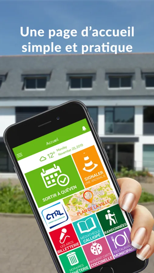 Signaler une anomalie pour que les services municipaux puissent intervenir rapidement, consulter les menus de la cantine scolaire, retrouver les horaires de la médiathèque ou de la déchèterie, connaître les prochains événements, trouver les horaires du prochain bus ou les coordonnées d’une association… Grâce à l’application Quéven, votre quotidien devient facile !