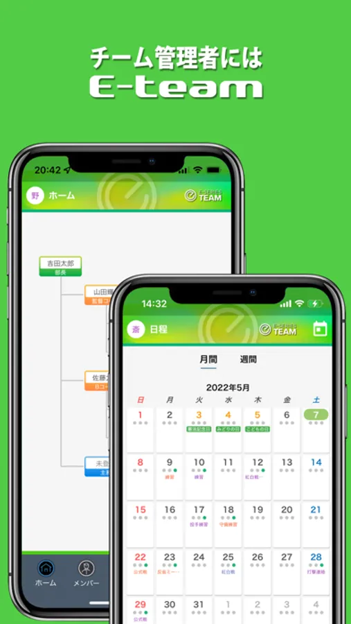チームの組織とメンバーの管理、活動スケジュールの管理、紅白戦や交流試合の管理など、部長やマネージャーなどの管理者向けの機能です。