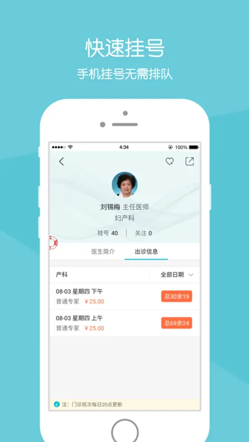 快速挂号:可根据时间段、科室、专家在手机上自由进行挂号和预约