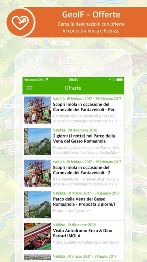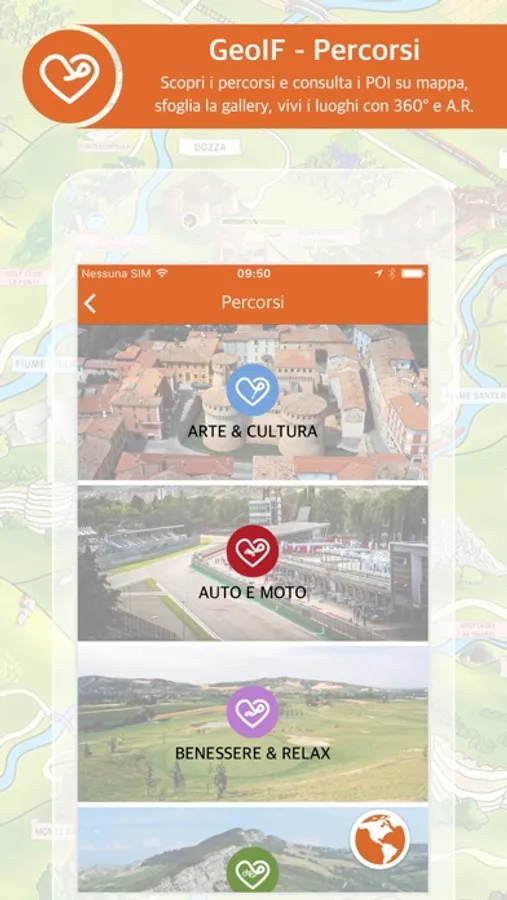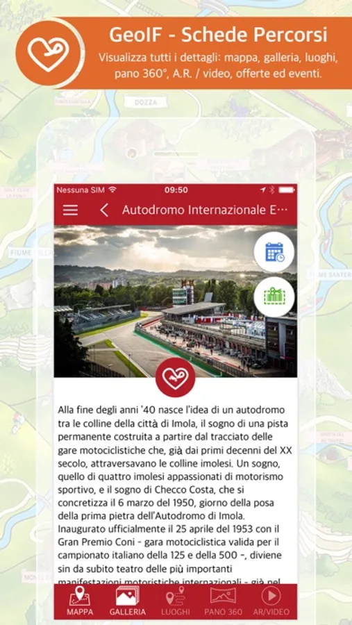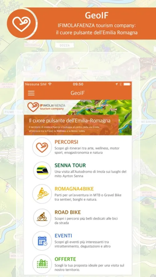 Tourist Mobile Application per la navigazione del territorio. L’applicazione espone risorse, servizi e utilità per vivere ed esplorare il territorio: la sua offerta turistica, ricettiva, culturale, enogastronomica e sportiva. L’applicazione si appoggia su servizi definiti da un back end e permette di lavorare on line e off line facendo perno sulla navigazione integrata di contenuti georeferenziati.