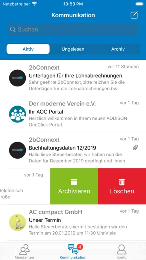 Mit der ADDISON OneClick App für Smartphone oder Tablet sind Sie immer mit Ihren Mandanten verbunden. Mit der integrierten Mandantenübersicht haben Sie direkten Zugriff auf die Nachrichten und bereitgestellten Auswertungen einzelner Mandanten.