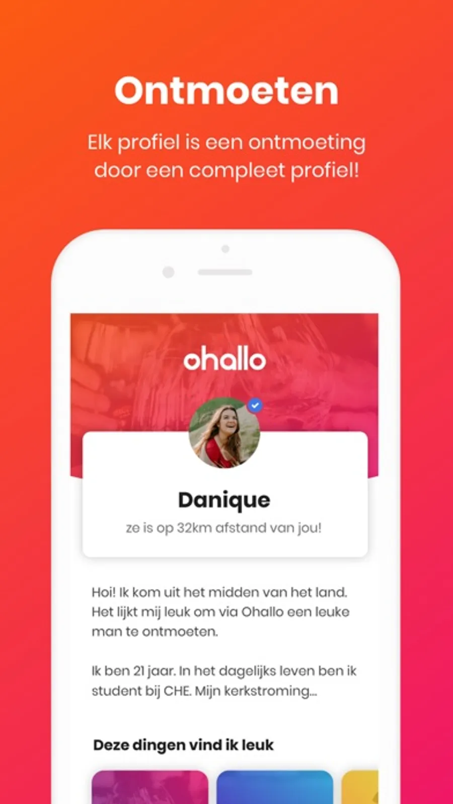 Ohallo is dé datingapp voor christelijke singles. Aanmelden is makkelijk én gratis. Nieuwe contacten leggen is leuk en gemakkelijk bij Ohallo: kom jij iemand tegen die jou leuk lijkt? Bekijk het uitgebreide profiel en like diegene daarna! Als iemand jou ook leuk vindt, heb je een match!