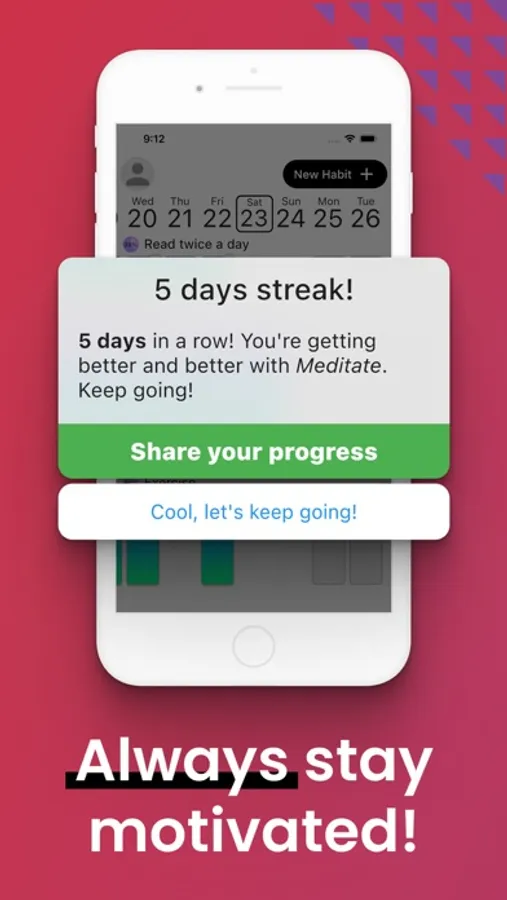 Don’t panic; developing habits takes time. Especially new habits. In some cases it can even take months. We are all creatures of habit; we always form and strengthen our old habits. To change an old, bad habit, you need willpower and time. Habit Challenge helps you track your progress, shows how far you've already come and reminds you that you need to stick to the new habit today as well.