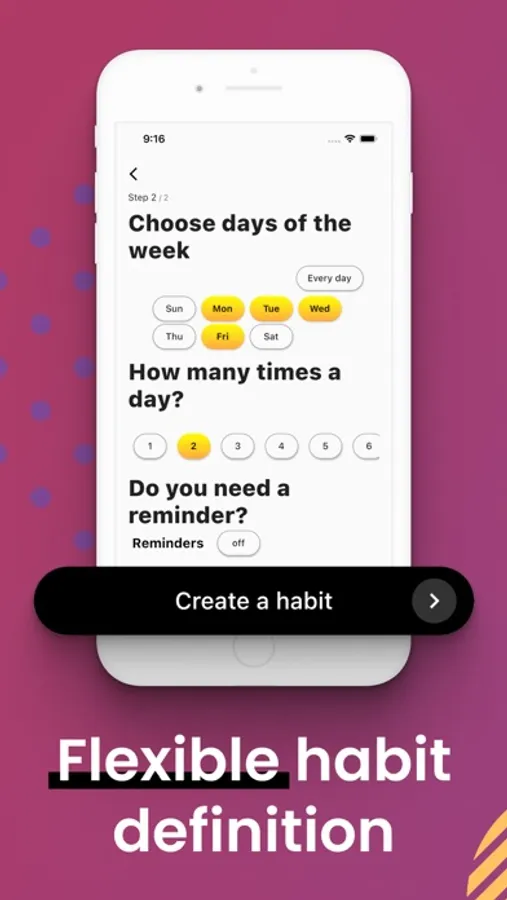 For each habit you can choose daily occurrence and days of the week when you want to perform it (e.g. exercise once a day on Mondays, Wednesdays and Saturdays; run twice a day on Tuesdays and Thursdays). You can also define multiple notifications for each habit. Use the habit maker as your habit reminder too, as you can set reminders for each habit you create within the app.