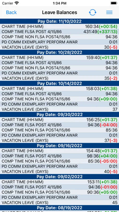 • Retrieves your official leave balances from ESS providing an easy graphical view to track and verify changes in your compensation time (e.g. vacation, FLSA, NON-FLSA, CHART, etc.).