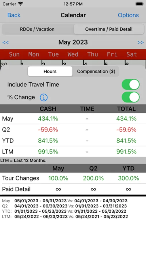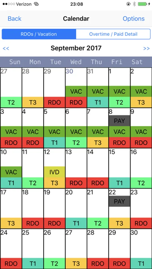 • Custom Calendar Events with color coding (Pay Dates, Overtime/Paid Detail Entries, Vacation, RDOs, IVDs, etc.)