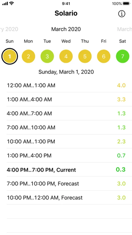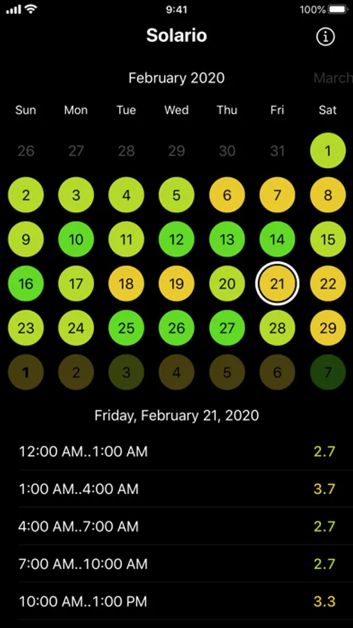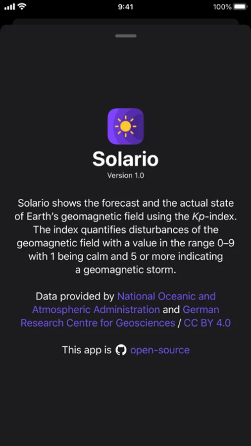 Solario shows the forecast and the actual state of Earth’s geomagnetic field using the Kp-index. The index quantifies disturbances of the geomagnetic field with a value in the range 0–9 with 0 being calm and 5 or more indicating a geomagnetic storm.