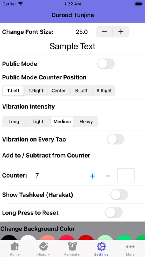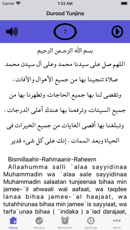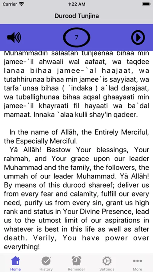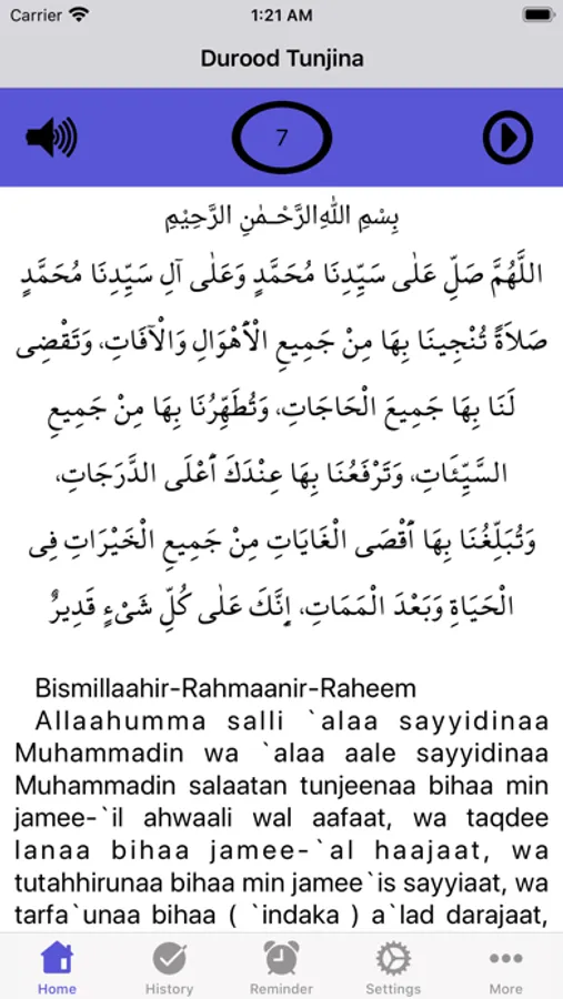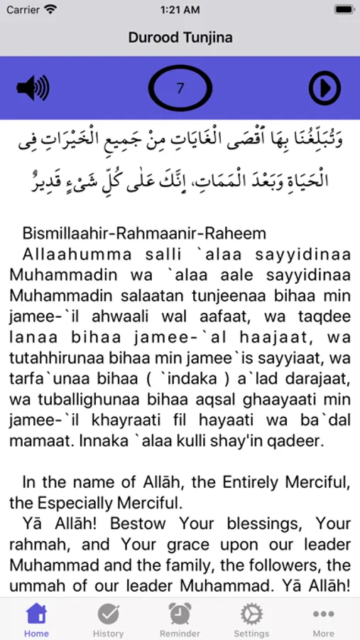 Durood Tunjina (Darood Tanjeena) application includes Arabic Font, transliteration in English and also the English meaning. Darood Tanjeena app remembers the last number that you were on while performing the recitation so that you can continue from where you left off when you relaunch the app.