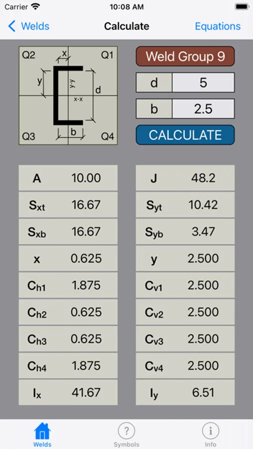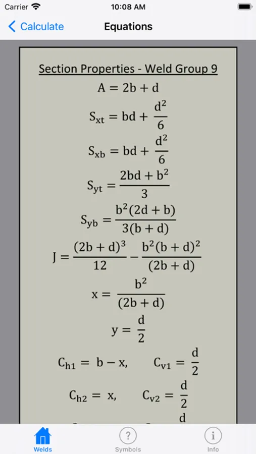 Useful for the preliminary sizing of welds, WeldEquations is an engineering calculator app that computes the section properties for typical welding patterns used in steel construction. After selecting a Weld Group, the user enters the dimensions for the depth and width. The section properties for the Weld Group, including the area, section moduli and polar moment of inertia, are instantly calculated.