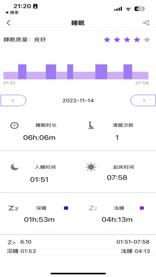 App同样也可以进行每天的睡眠监测,记录您的睡眠状态,判断睡眠质量。