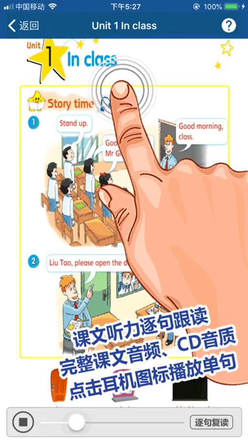点读功能:和课本同步原音发音,点击即可播放。并提供全文翻译。