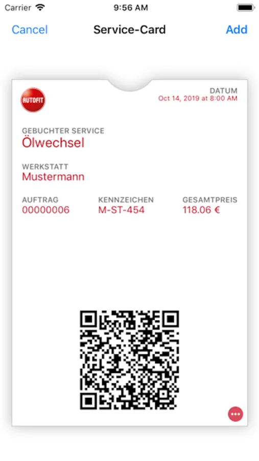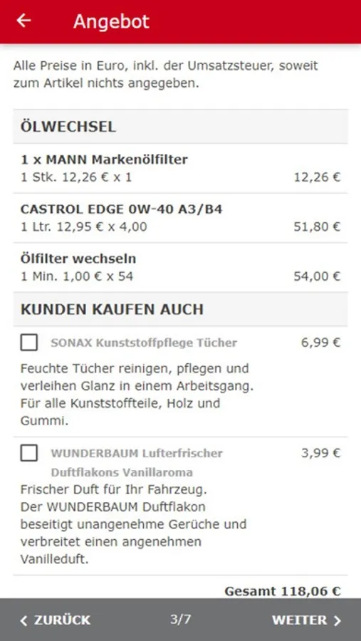 Sie können zudem Zusatzprodukte zu Ihrer gewählten Leistung erwerben und Ihre Präferenz der zu bestellenden Ersatzteile bestimmen. Ihre gebuchten Services können in Ihr Wallet hinzugefügt werden.