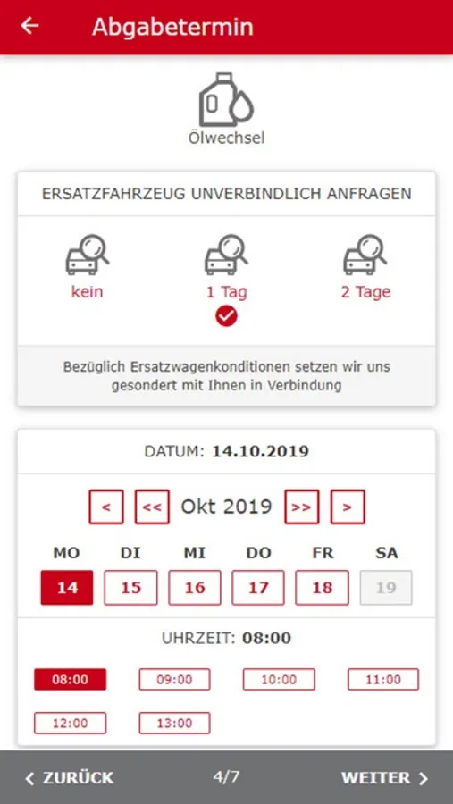 Wählen Sie Ihren Wunschtermin und –Uhrzeit -freie Termine Ihrer gewählten Werkstatt werden Ihnen angezeigt. Übernehmen Sie Ihre gebuchten Termine ganz einfach in Ihren persönlichen Kalender. Zusätzlich kann auch nach Bedarf ein Ersatzfahrzeug gebucht werden.