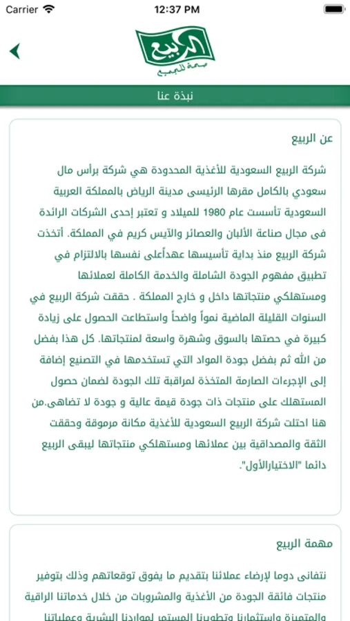 شركة الربيع السعودية للأغذية هي شركة برأس مال سعودي بالكامل مقرها الرئيسى مدينة الرياض بالمملكة العربية السعودية تأسست عام 1980 للميلاد و تعتبر إحدى الشركات الرائدة فى مجال صناعة الألبان والعصائر والآيس كريم في المملكة. أتخذت شركة الربيع منذ بداية تأسيسها عهداًعلى نفسها بالالتزام في تطبيق مفهوم الجودة الشاملة والخدمة الكاملة لعملائها ومستهلكي منتجاتها داخل و خارج المملكة . حققت شركة الربيع في السنوات القليلة الماضية نمواً واضحاً واستطاعت الحصول على زيادة كبيرة في حصتها بالسوق وشهرة واسعة لمنتجاتها. كل هذا بفضل من الله ثم بفضل جودة المواد التي تستخدمها في التصنيع إضافة إلى الإجرءات الصارمة المتخذة لمراقبة تلك الجودة لضمان حصول المستهلك على منتجات ذات جودة قيمة عالية و جودة لا تضاهى.من هنا احتلت شركة الربيع السعودية للأغذية مكانة مرموقة وحققت الثقة والمصداقية بين عملائها ومستهلكي منتجاتها ليبقى الربيع دائما "الاختيارالأول".