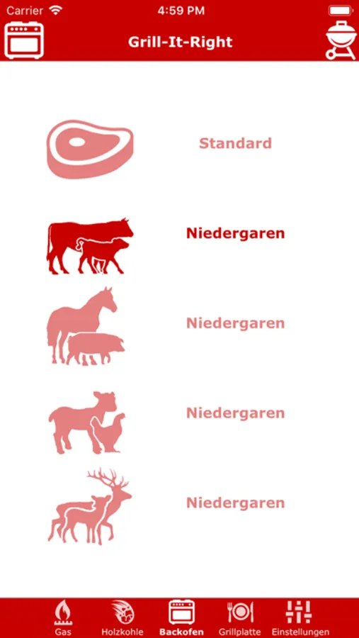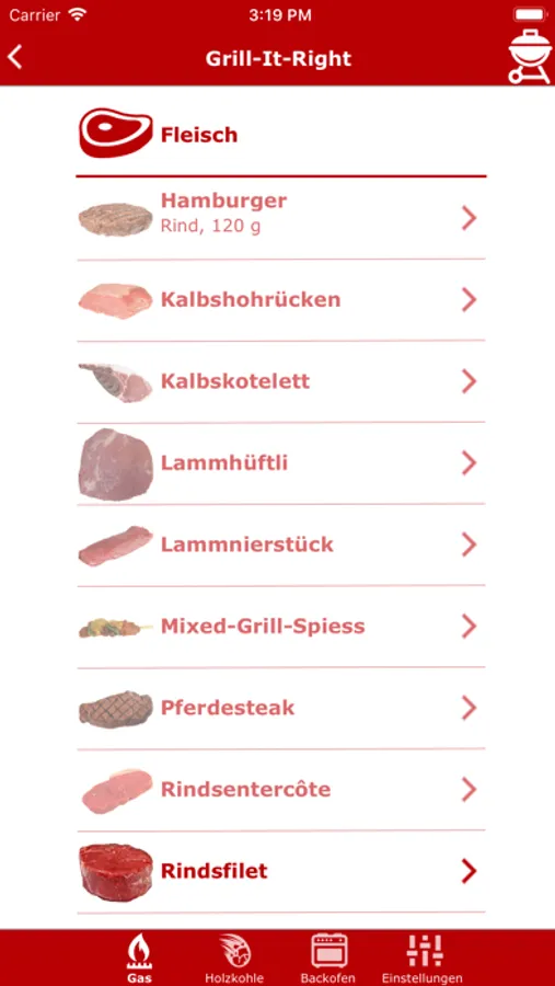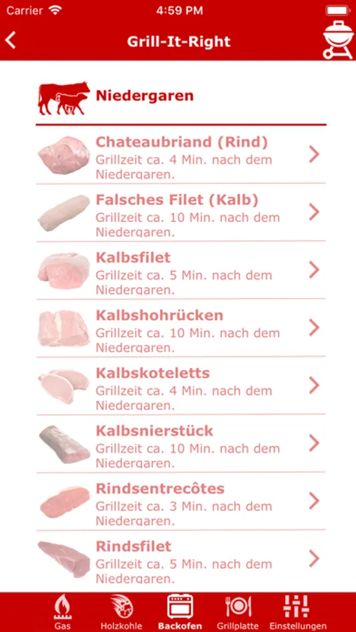 Angelehnt an die Migros Gripp App, die leider seit längerer Zeit nicht mehr verfügbar ist, beinhaltet die App aktuell 68 Grillstücke in 114 verschiedenen Dicken und 218 Garstufen von Fleisch und Wurstwaren, über Geflügel bis hin zu Fisch und Krustentieren ist alles vorhanden.