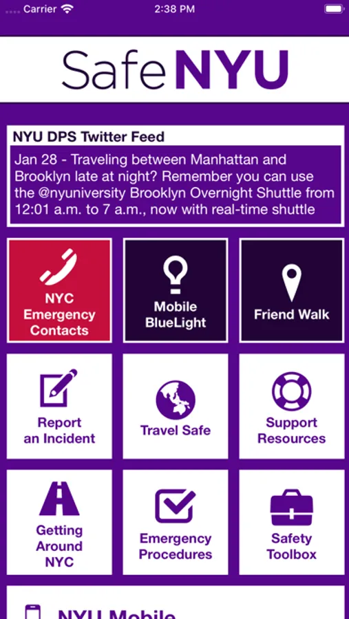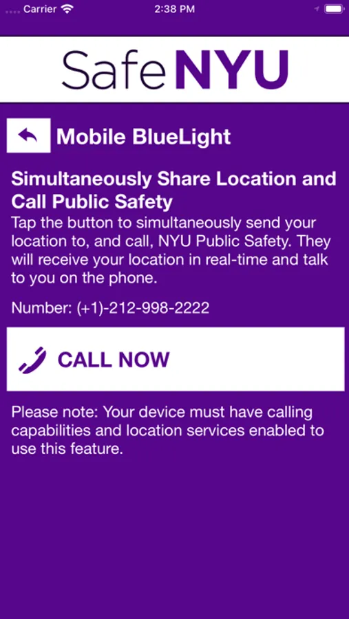 - Mobile BlueLight: Send your location to NYU Public Safety in real-time in case of a crisis