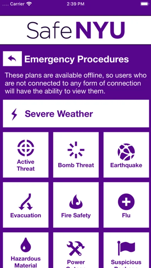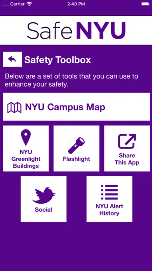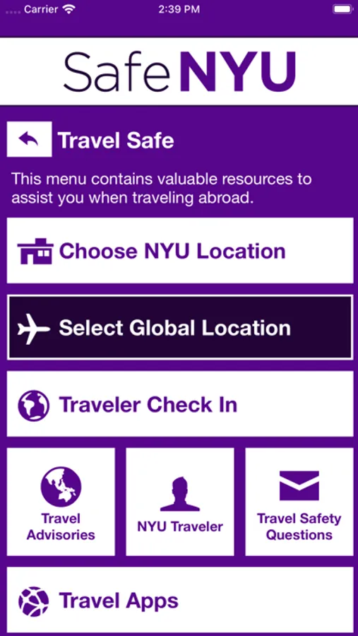Safe NYU is the official safety app of New York University. Safe NYU integrates closely with NYU's safety and security systems. NYU Public Safety has worked to develop a unique app that provides students, faculty and staff with added safety on NYU campuses. The app will send you important safety alerts and provide instant access to campus safety resources.