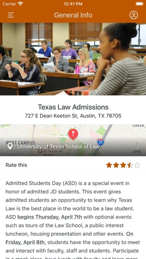 Welcome to the University of Texas School of Law! The Texas Law app allows you to access your schedule for Freshlaw Orientation and events hosted by the Admissions Office. It also provides helpful maps and links to resources that you will use throughout your first year of law school.