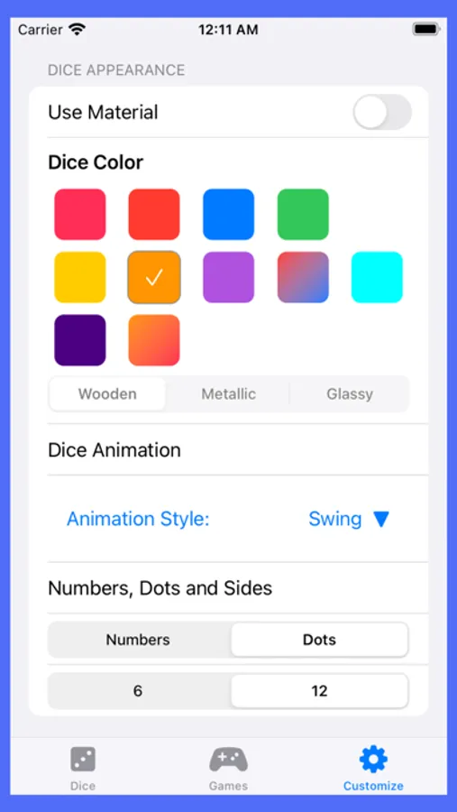 DiceShaker is a simple dice rolling app. Customize die by changing the color.