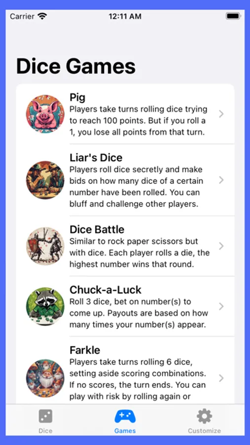 Play classic dice games like Pig, Danger Dice, Ship Captain Crew or invent new games with friends. Roll one die or shake two. See who can guess the total roll or take turns trying to reach a target number.