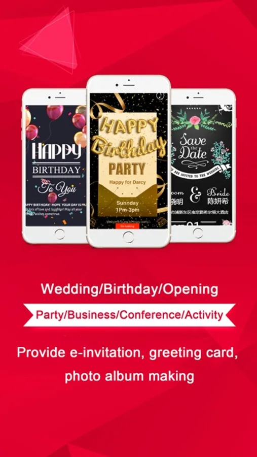 E-invitation, greeting cards, photo albums, etc. contain text, music, maps, videos and other multimedia display forms, diversified transmission of your information, zero distance interaction with your friends and relatives to share your joy and sincere invitation, and get the most sincere feedback in real time.