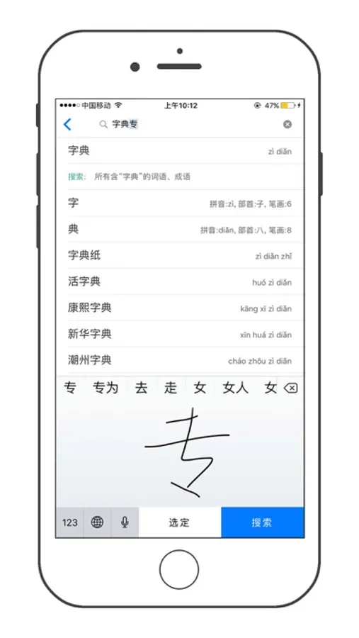 4,强大的逐字搜索功能。在基本或详细解释画面,触摸画面,选择其中任何一个汉字,就会显示有关这个汉字的解释画面,这个操作可以一直持续到您的设备没有内存为止。