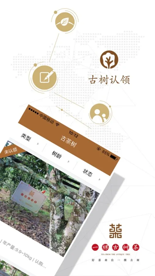 一棵古树茶是古树茶在线认领平台,以“让爱茶的人拥有一棵真正的古树茶”为企业使命,通过全新模式,强有力的信息系统支撑,保障古树茶全程可追溯的基础上,邀请用户在线参与古树茶专属认领,线下体验茶文化生态旅行,享受高端茶友社群资源,形成集古树茶认领、旅游观光、休闲度假、社群社交为一体的O2O服务体验新平台,成为引领普洱茶行业创新的旗帜品牌。