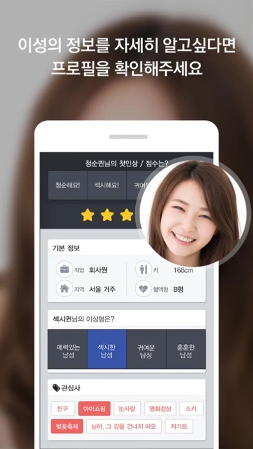 회원님의 이상형과 관심사가 비슷한 이성은 기본!