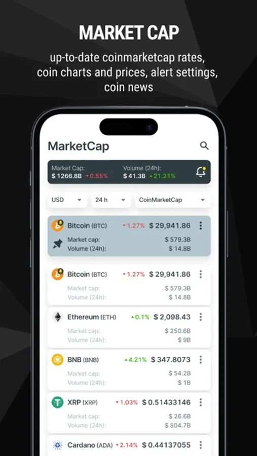 The app provides data on changes in the cryptocurrency market so that Crypto News users always have relevant information about the prices of coins and tokens. Users can find a specific coin by name or ticker: Bitcoin (BTC), Ethereum (ETH), Cardano (ADA), Shiba Inu (SHIB), Solana (SOL),XRP (XRP), Terra (LUNA), Dogecoin (DOGE), Polkadot (DOT), Tether (USDT), BNB (BNB), Polygon (MATIC), Avalanche (AVAX), Cronos (CRO), Decentraland (MANA), VeChain (VET), The Sandbox (SAND), Chainlink (LINK), etc.