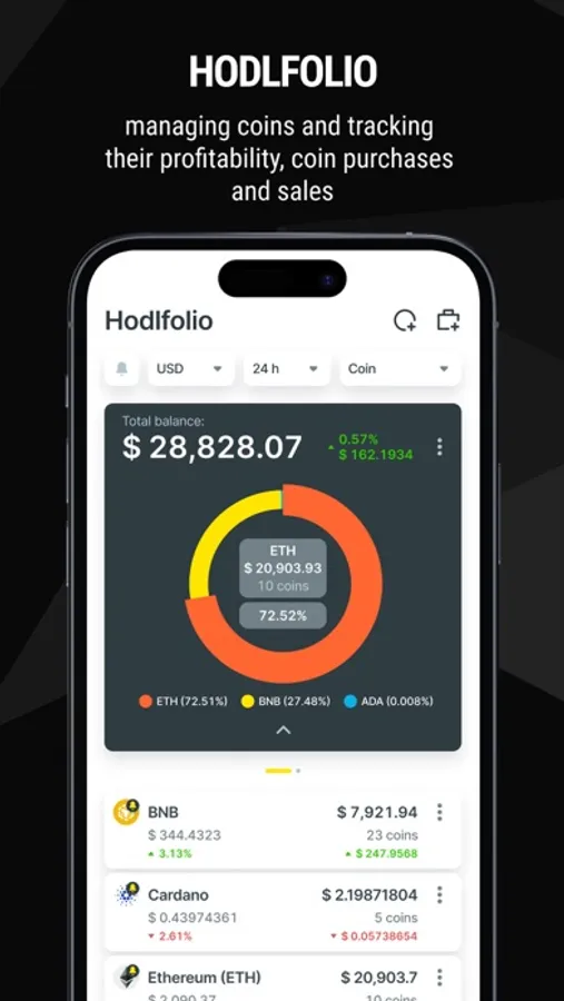 Hodlfolio displays both the overall balance and the value of each asset separately. You can select a period and calculate the profitability of holding coins. The portfolio total value can be displayed in fiat currencies and in cryptos.