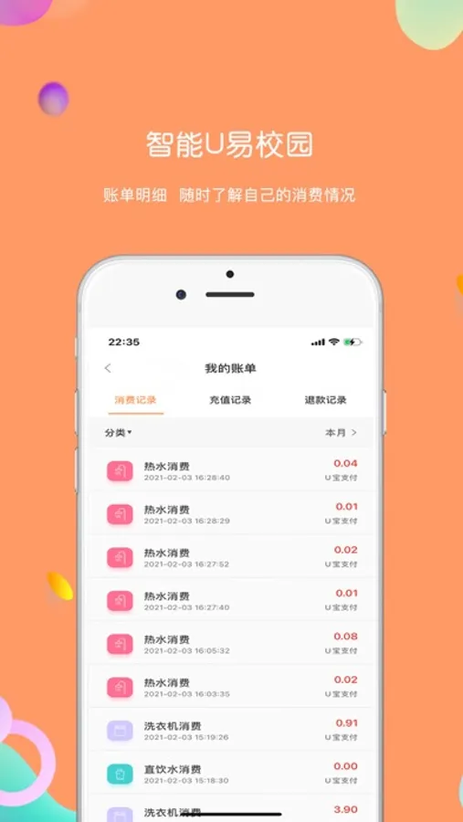 U易校园是为高校大学生提供生活服务便利服务型的APP,学生注册APP后,可以在上面充值水卡,饭卡等,还可以自助洗衣等功能,通过APP查询消费记录,申请退款,服务中心可以提交问题反馈,以及24小时拨打服务热线