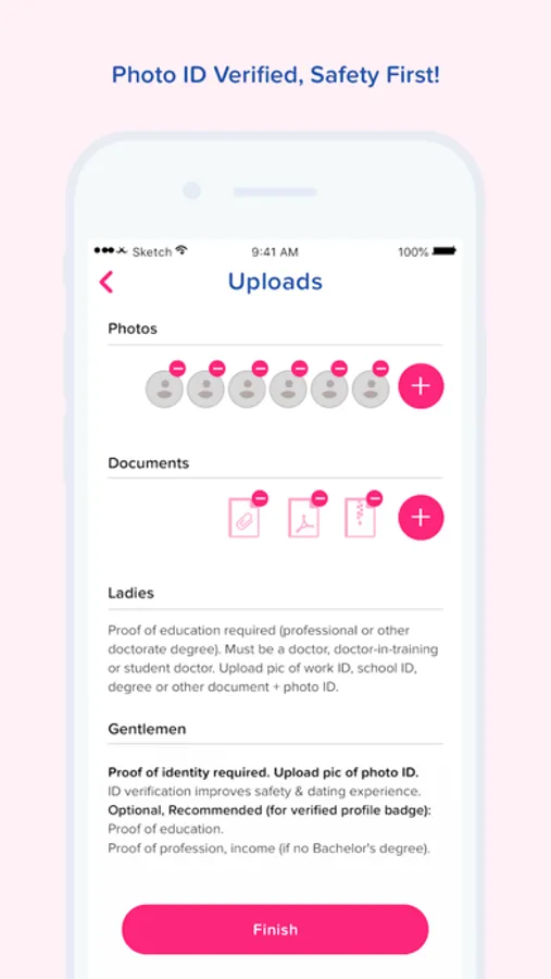 - Sign up with your profile info, pictures and upload photo ID (women must also provide proof of education).